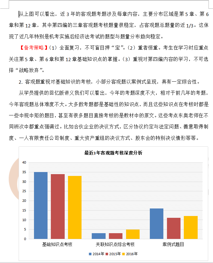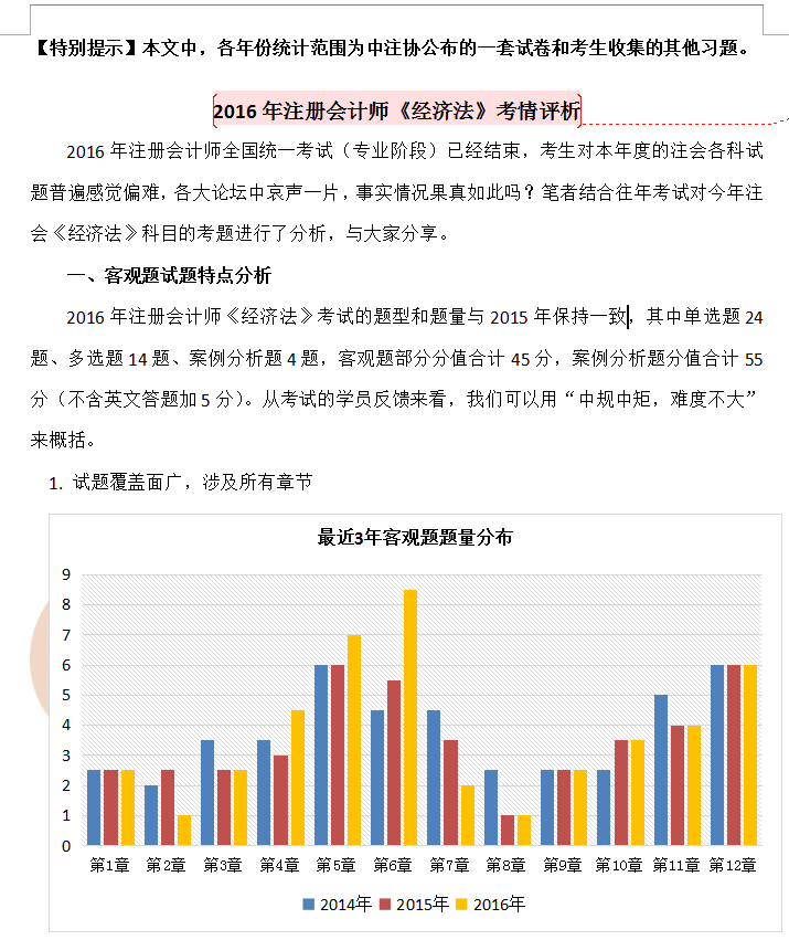 2016年注冊(cè)會(huì)計(jì)師全國(guó)統(tǒng)一考試(專(zhuān)業(yè)階段)已經(jīng)結(jié)束,考生對(duì)本年度的注會(huì)各科試題普遍感覺(jué)偏難,各大論壇中哀聲一片,事實(shí)情況果真如此嗎?筆者結(jié)合往年考試對(duì)今年CPA《經(jīng)濟(jì)法》科目的考題進(jìn)行了分析,與大家分享。