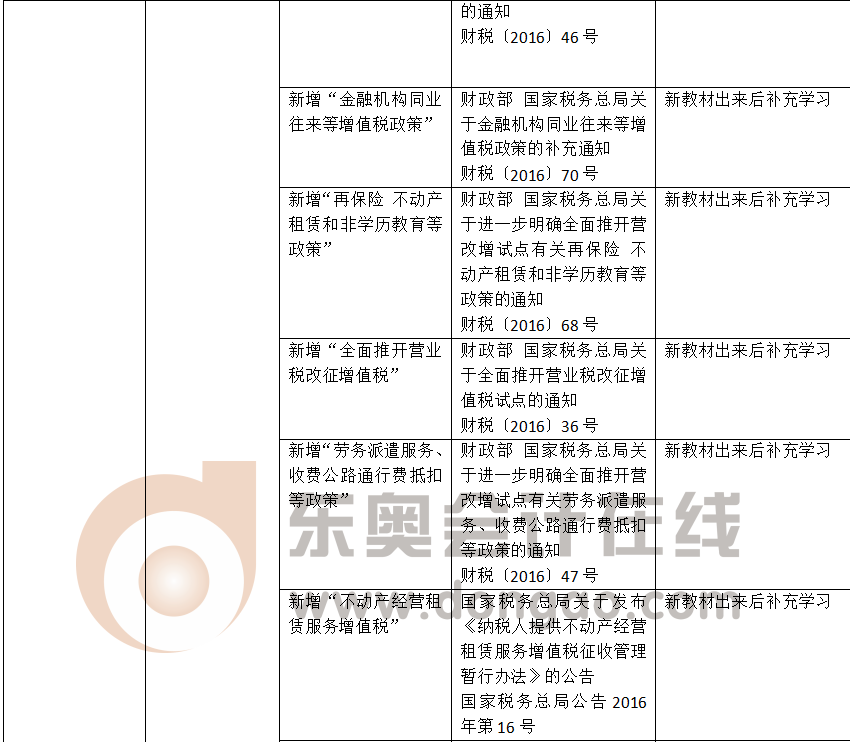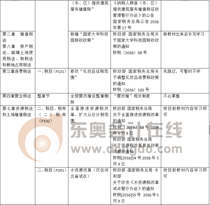 “營(yíng)改增”是2017年稅法備考的主旋律,在預(yù)習(xí)階段應(yīng)該有針對(duì)性的學(xué)習(xí)財(cái)稅〔2016〕36號(hào)文件中的相關(guān)知識(shí),營(yíng)改增的調(diào)整不僅僅涉及到營(yíng)業(yè)稅的取消和增值稅征稅范圍的擴(kuò)大,也會(huì)影響其他稅種的計(jì)算,比如土地增值稅、房產(chǎn)稅、企業(yè)所得稅、個(gè)稅所得稅等。所以現(xiàn)階段預(yù)習(xí)2017年的稅法內(nèi)容,遇到相關(guān)營(yíng)業(yè)稅的內(nèi)容要考慮“營(yíng)改增”后,相關(guān)的處理方式有什么調(diào)整。可以參考2016年稅務(wù)師相關(guān)教材和輔導(dǎo)資料學(xué)習(xí)這部分內(nèi)容。除了“營(yíng)改增”之外,資源稅從價(jià)改革的范圍進(jìn)一步擴(kuò)大,相信此項(xiàng)調(diào)整也會(huì)體現(xiàn)在2017年的注會(huì)輔導(dǎo)教材之上。