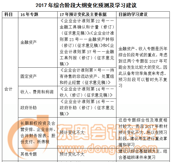 2017年注會考試備考已經開始了,在大綱未發(fā)布前也許大家是迷茫的,2017年注冊會計師考試綜合階段大綱變動到底大不大?在大綱還沒公布前學習2016年的課程是否可行?很多人在猶豫、徘徊中,時間就這么過去了,為了幫忙大家順利進入學習狀態(tài),了解2017年注冊會計師考試綜合大綱變化情況,東奧老師給出了預測,抓緊時間開始備戰(zhàn)吧!