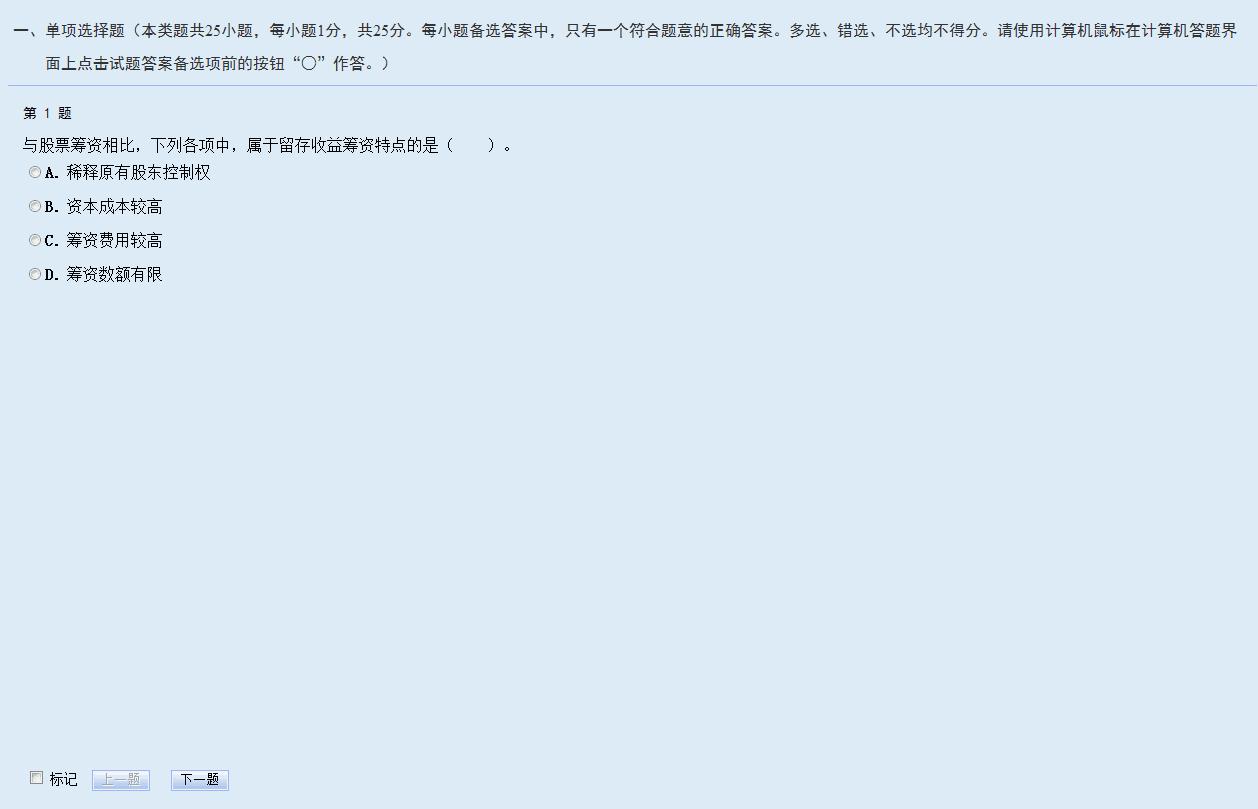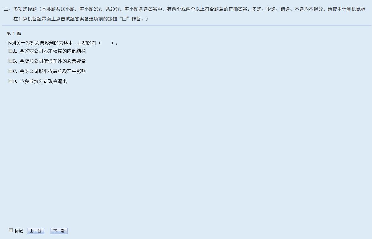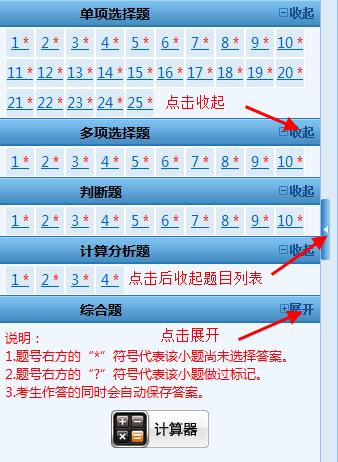 1. 根據(jù)考試科目不同,題目類型分為單項選擇題、多項選擇題、判斷題、計算分析題、簡答題和綜合題。題號右方的"*"號表示該小題還未作答,"?"號表示該小題做過標(biāo)記??忌梢酝ㄟ^題號列表查看本考試科目全套試卷的作答情況(包括每道試題的已答或未答狀態(tài)、標(biāo)記狀態(tài)),還可點擊各題號按鈕,直接進入各試題進行答題或檢查。
