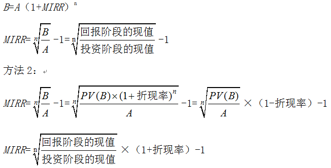 修正的內含報酬率法認為項目收益被再投資時不是按照內含報酬率來折現(xiàn)的,一般認為現(xiàn)金流量以資金成本進行再投資的假設較為合理,具體計算有如下兩種方法: