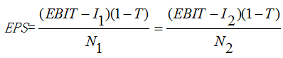 公司財務(wù)目標(biāo)是使股東財富或公司價值最大化,每股收益(EPS)可以作為衡量股東財富的主要替代變量(非上市公司則以凈資產(chǎn)收益率ROE來替代),被認(rèn)為是影響公司股票股價的重要指針。公司每股收益=(EBIT-利息)×(1-所得稅稅率)/發(fā)行在外普通股股數(shù)。企業(yè)在融資決策過程中,假定未來項目的預(yù)期投資收益(EBIT)存在變動性,因此可以通過比較不同融資方式對EPS影響大小來進(jìn)行優(yōu)化選擇。這就是EBIT-EPS無差異分析法。