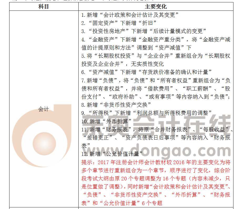 2017年度注冊會計師全國統(tǒng)一考試大綱公布,其中注會綜合階段大綱有一些變化,針對這些變化,東奧會計在線逐一為您進行解讀分析。