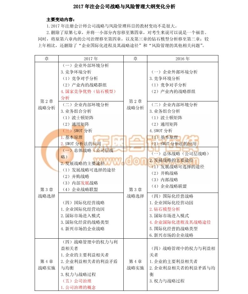2017年注冊會計師考試大綱已經(jīng)公布,東奧老師對2017年與2016年注會《戰(zhàn)略》考試大綱變化進行了對比分析,希望大家及時了解注會大綱變化情況。