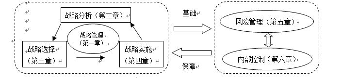 《公司戰(zhàn)略與風險管理》教材內容分為2個層次:一是戰(zhàn)略管理,涉及第一-第四章;二是風險管理和內部控制,涉及第五-第六章。2個層次并非獨立存在的,之間具有很強的關聯性,戰(zhàn)略管理是基礎,風險管理和內部控制是實現戰(zhàn)略管理的保障,具體章節(jié)結構和關系如下圖:
