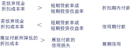 如果面對兩家以上提供不同信用條件的賣方,應(yīng)通過衡量放棄折扣成本的大小,選擇信用成本最小(或所獲利益最大)的一家。