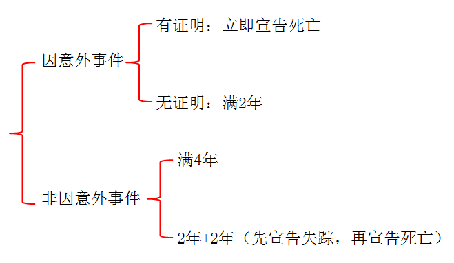 (1)自然人下落不明滿4年或因意外事件、下落不明滿2年(因意外事件下落不明,經(jīng)有關(guān)機(jī)關(guān)證明該自然人不可能生存的,申請宣告死亡不受2年時間的限制)的,利害關(guān)系人可以向人民法院申請宣告該自然人死亡。