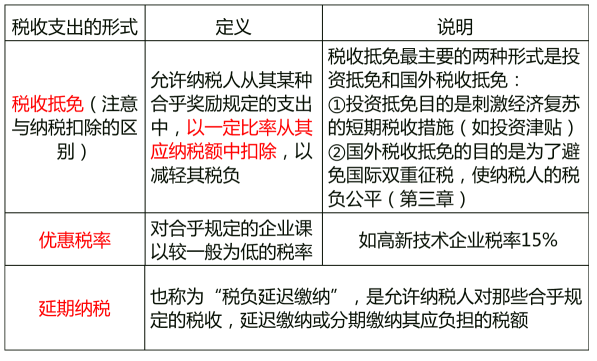 【解析】稅收支出包括稅收豁免、納稅扣除、優(yōu)惠稅率、稅收抵免、盈虧相抵、加速折舊、退稅。