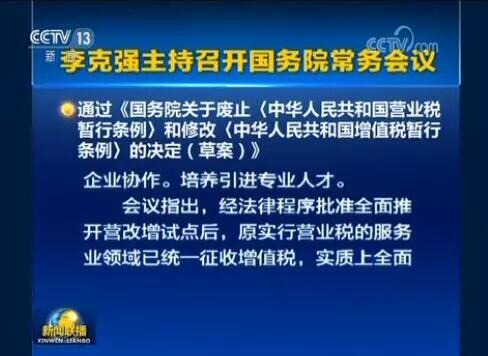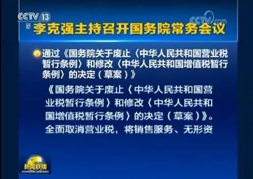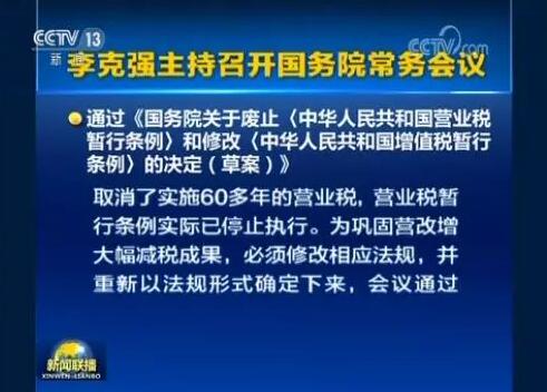 國務(wù)院總理李克強(qiáng)10月30日主持召開國務(wù)院常務(wù)會(huì)議,通過《國務(wù)院關(guān)于廢止〈中華人民共和國營業(yè)稅暫行條例〉和修改〈中華人民共和國增值稅暫行條例〉的決定(草案)》,推動(dòng)營改增改革成果法治化。