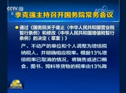 會(huì)議指出,經(jīng)法律程序批準(zhǔn)全面推開營改增試點(diǎn)后,原來實(shí)行營業(yè)稅的服務(wù)業(yè)領(lǐng)域已統(tǒng)一征收增值稅,實(shí)質(zhì)上全面取消了實(shí)施60多年的營業(yè)稅,營業(yè)稅暫行條例實(shí)際已停止執(zhí)行。為鞏固和擴(kuò)大營改增大幅減稅成果,必須修改相應(yīng)法規(guī),并重新以法規(guī)形式確定下來,會(huì)議通過《國務(wù)院關(guān)于廢止〈中華人民共和國營業(yè)稅暫行條例〉和修改〈中華人民共和國增值稅暫行條例〉的決定(草案)》。全面取消營業(yè)稅,調(diào)整完善增值稅征稅范圍,將銷售服務(wù)、無形資產(chǎn)、不動(dòng)產(chǎn)的單位和個(gè)人規(guī)定為增值稅納稅人,并明確相應(yīng)稅率。根據(jù)13%這一檔增值稅率已取消的情況,將銷售或進(jìn)口糧食、圖書、飼料等貨物的稅率由13%降至11%。同時(shí),目前對(duì)部分行業(yè)實(shí)施的過渡性政策保持不變??紤]到下一步深化改革的實(shí)際需要,草案明確,對(duì)納稅人繳納增值稅的有關(guān)事項(xiàng),國務(wù)院或經(jīng)國務(wù)院同意由財(cái)政、稅務(wù)主管部門另作規(guī)定的,依照其規(guī)定執(zhí)行。