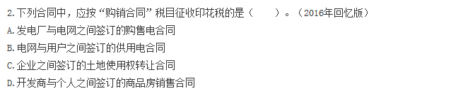 【解析】選項AB:對發(fā)電廠與電網(wǎng)之間、電網(wǎng)與電網(wǎng)之間簽訂的購售電合同按購銷合同征收印花稅。電網(wǎng)與用戶之間簽訂的供用電合同不屬于印花稅列舉征稅的憑證,不征印花稅。選項CD:土地使用權(quán)轉(zhuǎn)讓合同和商品房銷售合同按產(chǎn)權(quán)轉(zhuǎn)移書據(jù)稅目繳納印花稅。