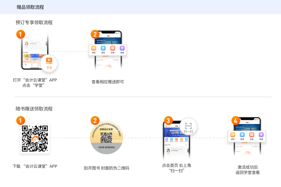 | 同步練習(xí)題庫 | 【隨書贈送】本書試題支持APP在線同步做題,您可以在APP“題庫”專區(qū)相應(yīng)模塊做題。 | 登錄”會計云課堂app“,點擊“我的”—“圖書激活”,掃描防偽標簽碼激活后,返回學(xué)堂查看即可。 | |