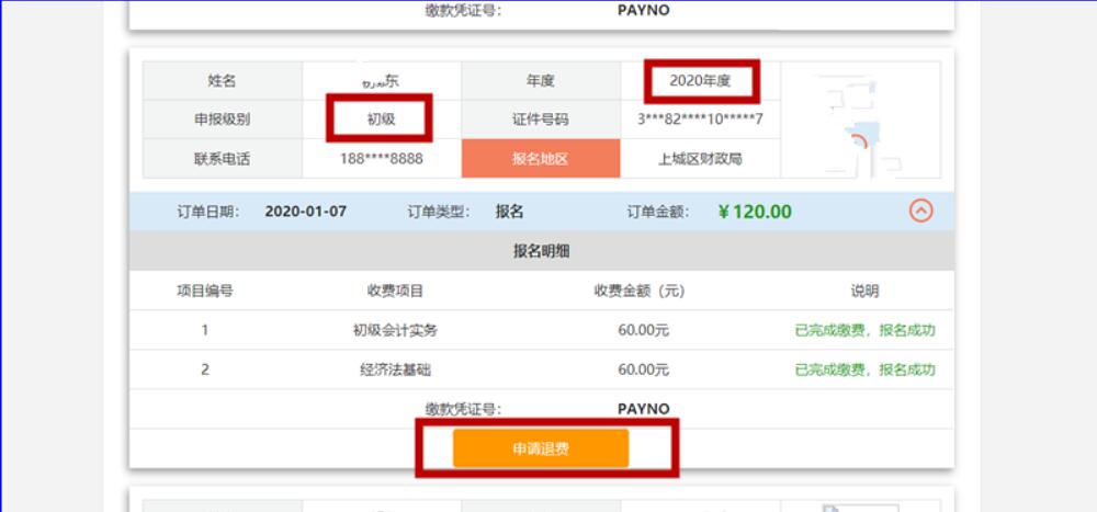 3、網(wǎng)頁中將跳出報(bào)名訂單,找到您的2020年會(huì)計(jì)初級(jí)資格考試報(bào)名信息,點(diǎn)擊下方的“申請(qǐng)退費(fèi)”按鈕。