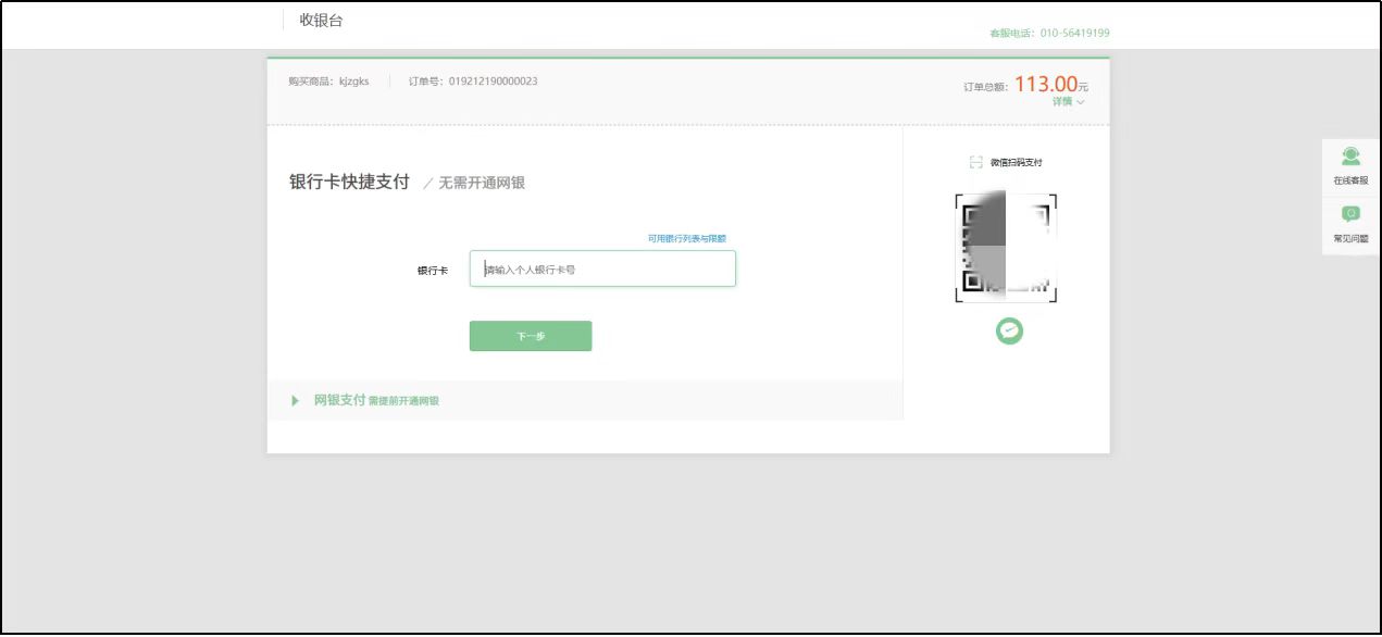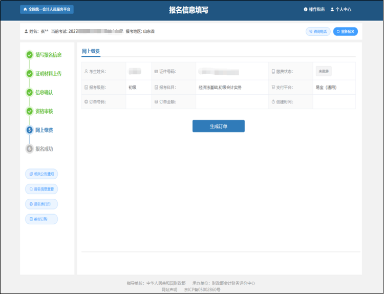 等待審核通過(guò)后,重新選擇考試會(huì)直接進(jìn)入到網(wǎng)上繳費(fèi)的頁(yè)面。頁(yè)面展示考生報(bào)名基本信息、訂單基本信息、支付平臺(tái)以及繳費(fèi)狀態(tài)信息。如下圖所示: