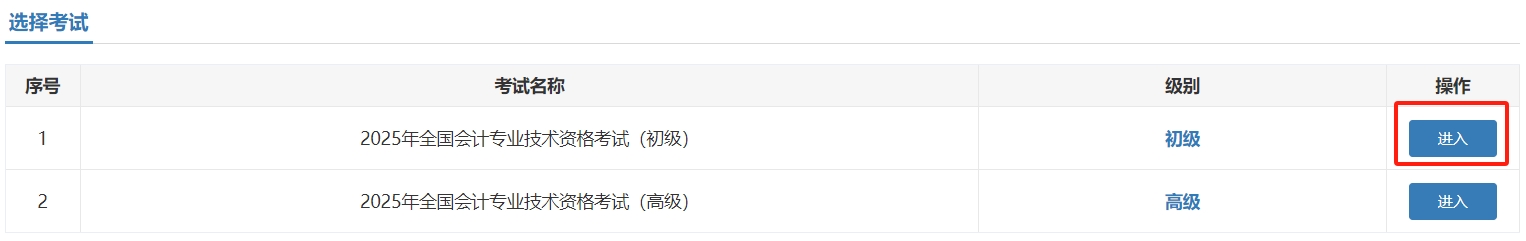 點(diǎn)擊“會(huì)計(jì)專業(yè)技術(shù)資格考試”,會(huì)直接進(jìn)入到選擇考試界面,點(diǎn)擊初級(jí)考試操作列表中的“進(jìn)入”按鈕進(jìn)行該場(chǎng)考試的報(bào)名,如下圖所示: