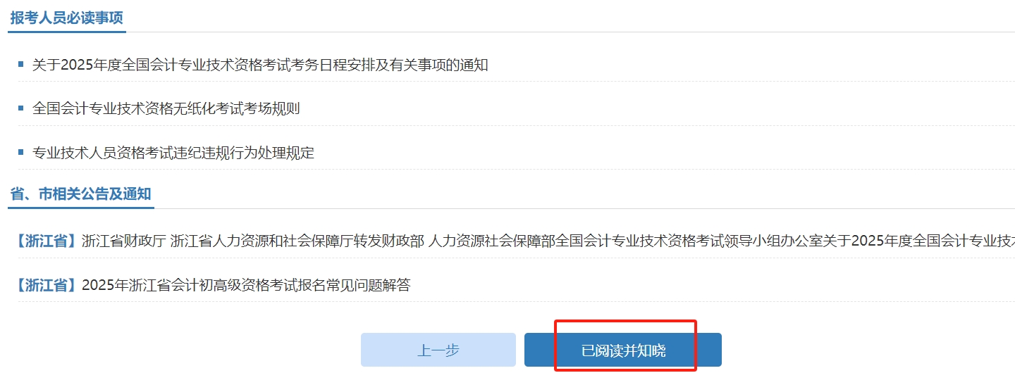 完成閱讀須知后,進(jìn)入到所選擇省份設(shè)置的通知公告頁(yè)面,包括報(bào)考人員必讀事項(xiàng)以及省、市相關(guān)公告及通知。點(diǎn)擊“已閱讀并知曉”,如下圖所示: