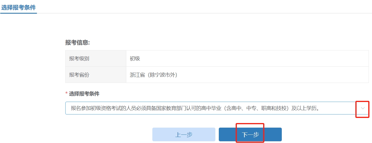 進(jìn)入到選擇報(bào)考條件頁(yè)面,頁(yè)面展示報(bào)名信息,包含報(bào)考級(jí)別以及報(bào)考省份。在選擇完報(bào)考條件后,點(diǎn)擊下一步。如下圖所示: