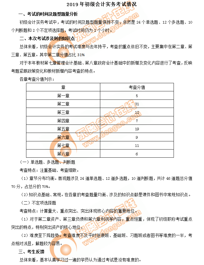 通過以上內(nèi)容不難發(fā)現(xiàn),2019年《初級會計實務》考試難度適中,認真跟老師學習過一遍的考生,通過考試都是沒有太大問題的。希望后面批次的考生能夠結(jié)合考情分析和考生考后討論,總結(jié)經(jīng)驗,決勝初級!