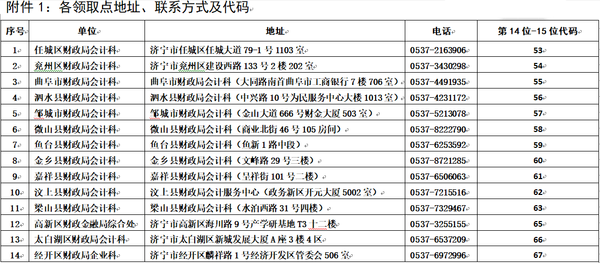 證書管理號(hào)第14至15位,為領(lǐng)取地代碼,如XXXXXXXXXXX53XXXXXX,領(lǐng)取地點(diǎn)為任城區(qū)財(cái)政局會(huì)計(jì)科。濟(jì)寧市14個(gè)領(lǐng)取點(diǎn)詳細(xì)信息見附件1。