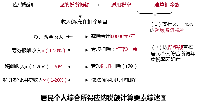 =(每一納稅年度收入額-費用6萬元-專項扣除-專項附加扣除-依法確定的其他扣除)×適用稅率-速算扣除數(shù)