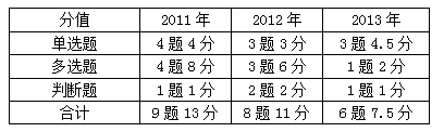 在最近3年的考試中,本章的平均分值為10.5分,2013年的分值為7.5分,題型全部為客觀題。本周考點(diǎn)較多,大多數(shù)考點(diǎn)需要死記硬背。在2014年的考試中,本站分值估計(jì)在10分左右。