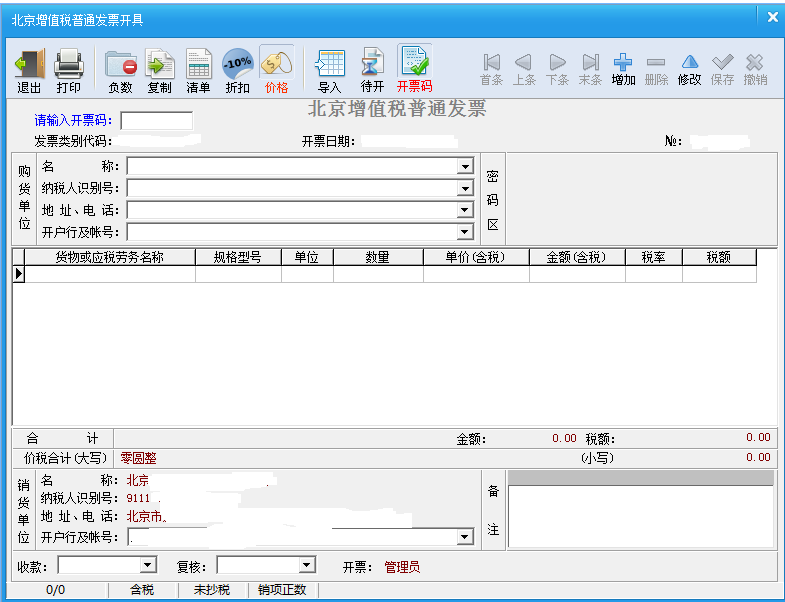 2、假如進(jìn)入北京增值稅專用發(fā)票界面,我們是在普票填列的基礎(chǔ)上,再加填“地址、電話”、“開(kāi)戶行及賬號(hào)”