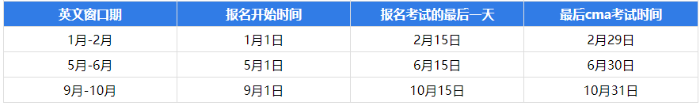 2024年cma英文報名和考試時間是什么時候?考試屬于預(yù)約式報名,每次考試報名時間并不相同,具體以官方發(fā)布時間為準(zhǔn)。cma英文考試每年有三個窗口期,每次考試窗口開放時間為2個月,分別為1月/2月,5月/6月,9月/10月。