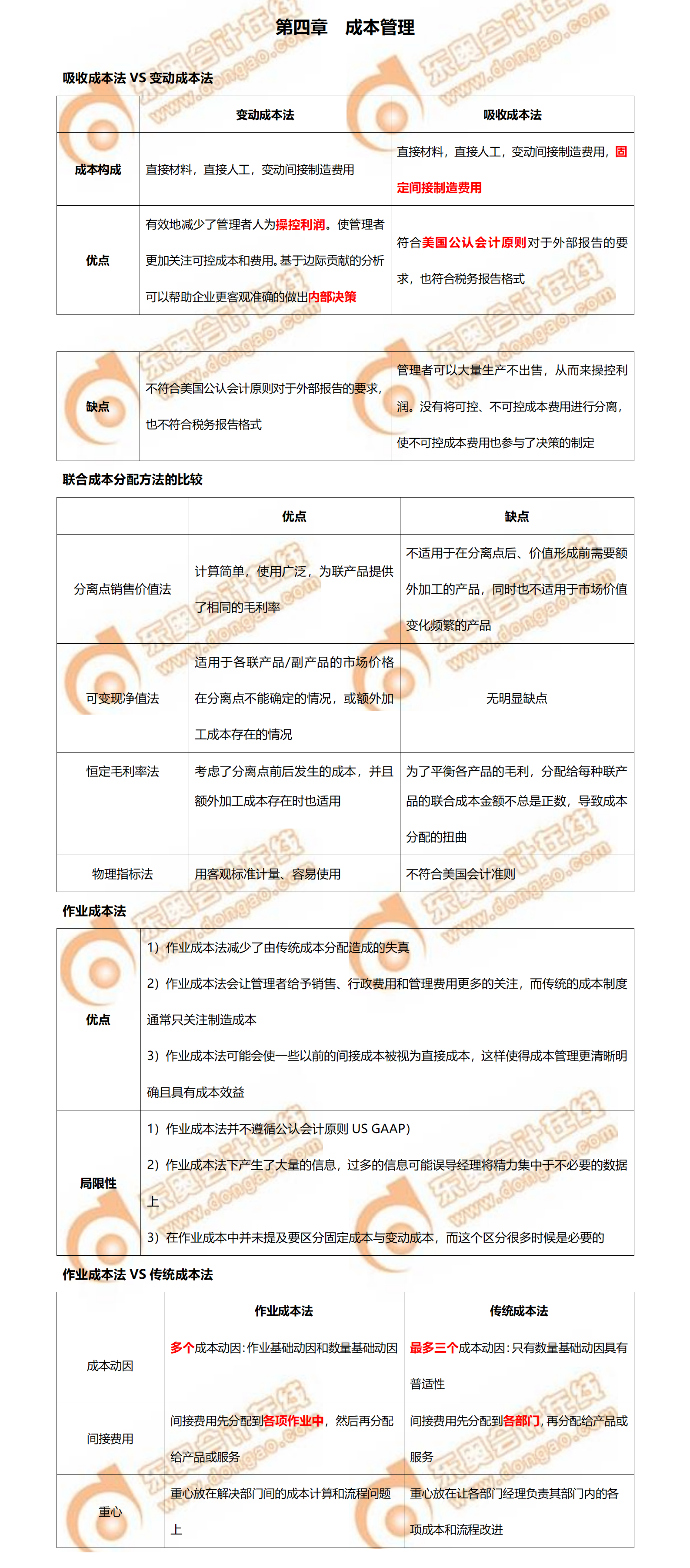 2023年cma《財務規(guī)劃、績效與分析》考試大綱沒有變動,以2023年4月cma考試為例,第四章客觀題涉及的考點有標準成本法、作業(yè)成本法、約當產(chǎn)量、吸收成本法、聯(lián)合成本法、生命周期、JIT的特征、質(zhì)量成本分析、價值鏈等,現(xiàn)整理第四章思維導圖整理如下。