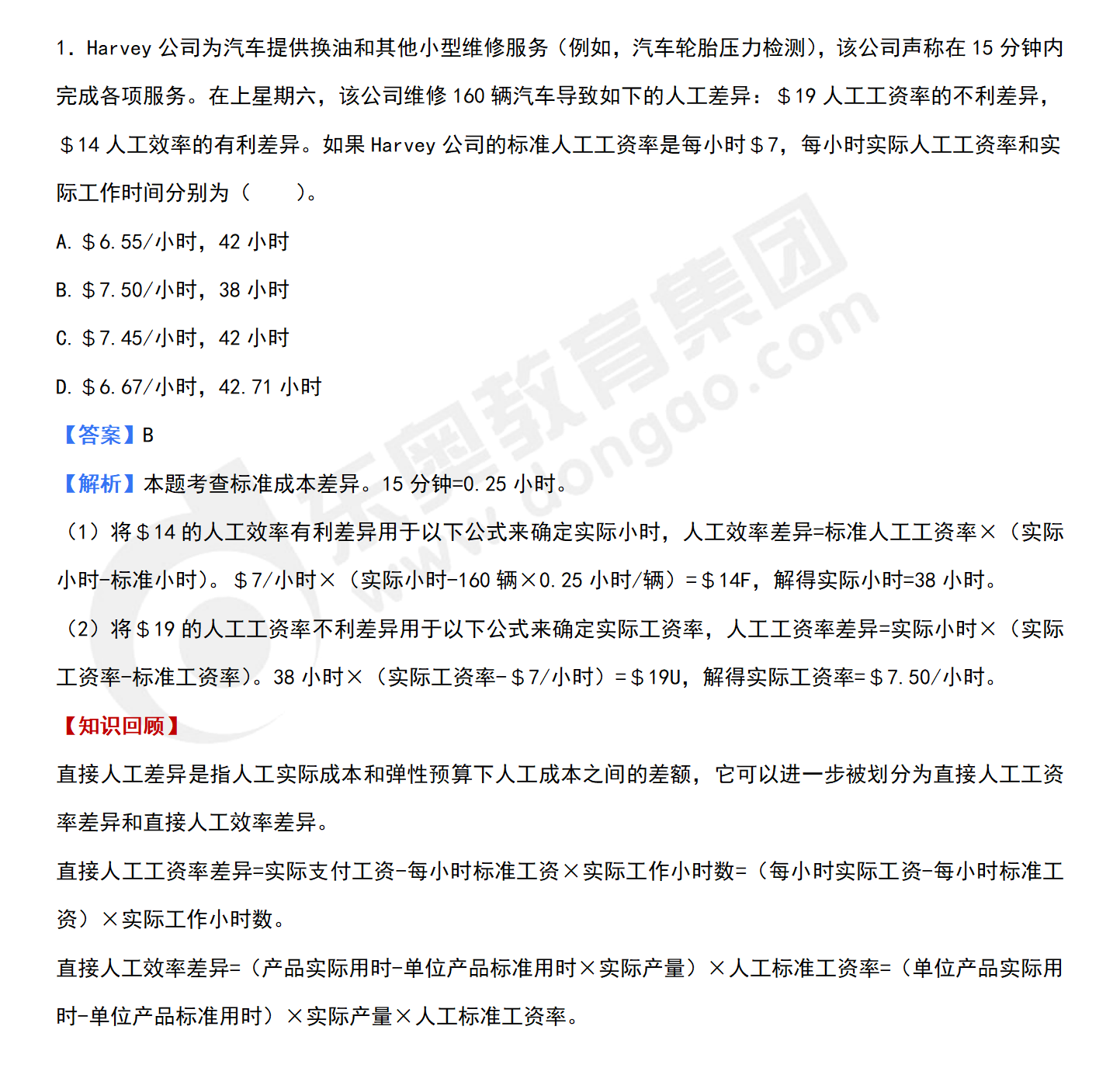 1.Harvey公司為汽車提供換油和其他小型維修服務(例如,汽車輪胎壓力檢測),該公司聲稱在15分鐘內完成各項服務。在上星期六,該公司維修160輛汽車導致如下的人工差異:$19人工工資率的不利差異,$14人工效率的有利差異。如果Harvey公司的標準人工工資率是每小時$7,每小時實際人工工資率和實際工作時間分別為(  )。