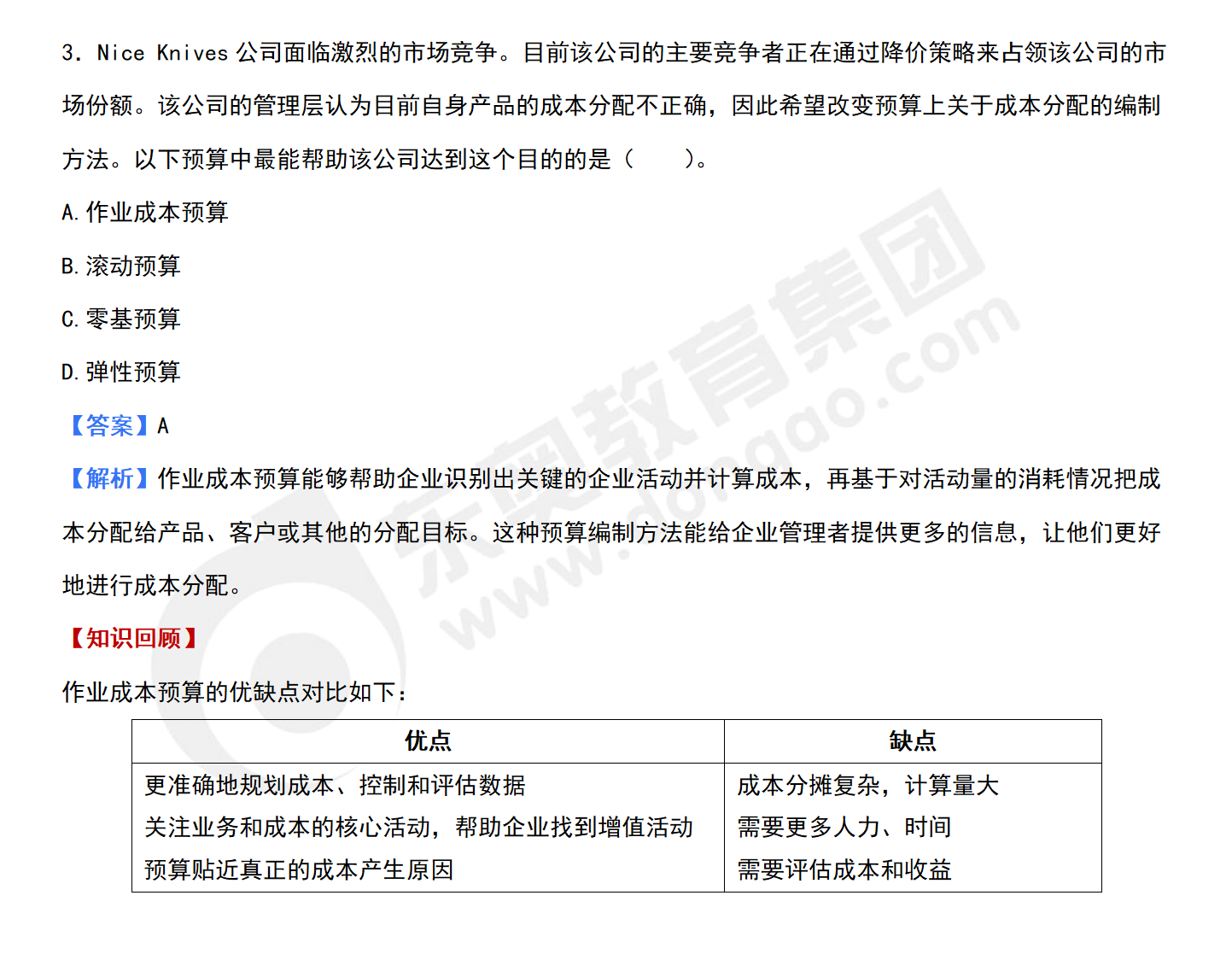 3.Nice Knives公司面臨激烈的市場競爭。目前該公司的主要競爭者正在通過降價策略來占領該公司的市場份額。該公司的管理層認為目前自身產品的成本分配不正確,因此希望改變預算上關于成本分配的編制方法。以下預算中最能幫助該公司達到這個目的的是( ?。?。