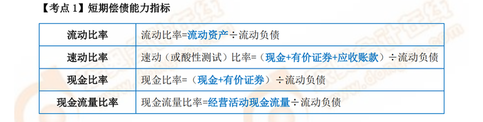 2.本章的公式看似雜亂無章,但是還是有規(guī)律可循的,可以將具有相同或相似特點(diǎn)的公式對(duì)比記憶,以財(cái)務(wù)比率這一部分為例,流動(dòng)比率、速動(dòng)比率、現(xiàn)金比率、現(xiàn)金流量比率這幾個(gè)體現(xiàn)流動(dòng)性的指標(biāo)可以放在一起記憶,其公式中分母都為流動(dòng)負(fù)債,只有分子不同,只需要區(qū)分分子即可。