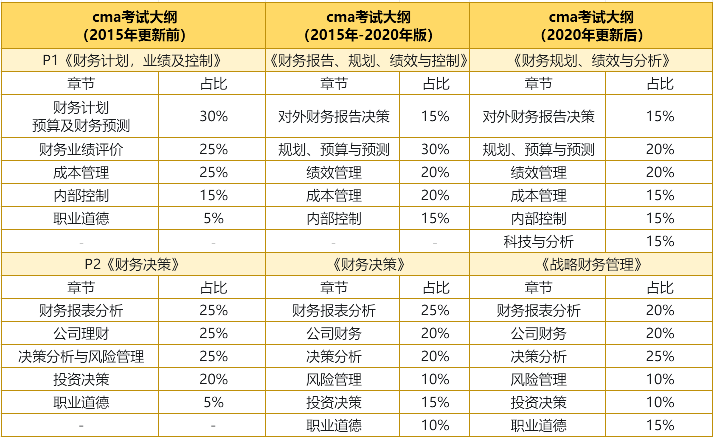 cma考試與中級(jí)、注會(huì)等考試不同,cma考試大綱和教材并非每年調(diào)整。根據(jù)以往cma考試大綱的更新頻率,大概每五年進(jìn)行更新一次,自2020年新考綱更新實(shí)行后,考試難度調(diào)整為C級(jí),分值比重也有一定的變化,2023年考試仍使用現(xiàn)有考試大綱,不做新的調(diào)整?,F(xiàn)將歷年CMA考試大綱更新內(nèi)容整理如下,可參考: