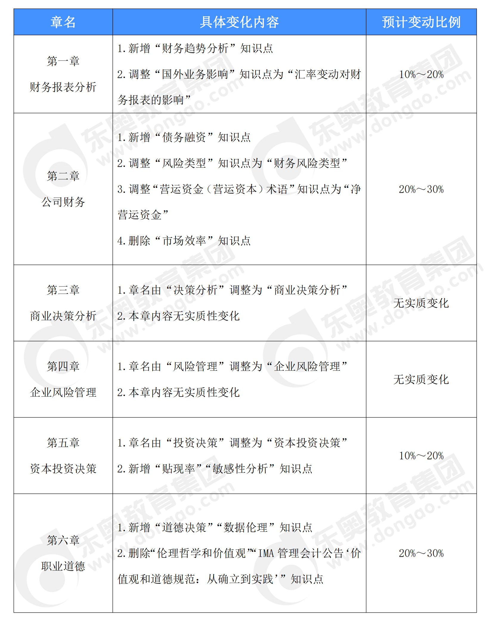 從考綱來(lái)看,每章的分值占比、考試的題型題量和每章的能力等級(jí)要求基本無(wú)變化,但具體內(nèi)容變化較大,其中,《財(cái)務(wù)規(guī)劃、績(jī)效與分析》科目中第一章、第四章、第五章、第六章變化較大,《戰(zhàn)略財(cái)務(wù)管理》科目中第一章、第二章、第五章、第六章變化非常大。