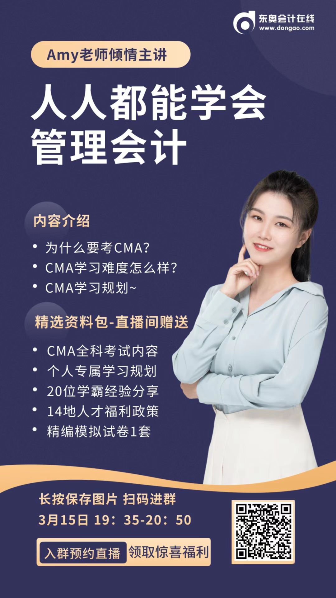 隨著cma在國內(nèi)的知名度逐漸上漲,報考cma考試的人也越來越多,如果你還在猶豫要不要報考cma,那么本場直播能夠解決你對cma的大部分問題,看完直播相信你就會做出正確選擇了,讓我們一起相約在3月15日直播吧!人人都能學(xué)會管理會計!19:35準(zhǔn)時開課!