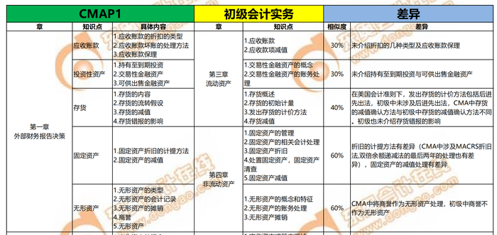 初級(jí)會(huì)計(jì)考試科目《初級(jí)會(huì)計(jì)實(shí)務(wù)》和《經(jīng)濟(jì)法基礎(chǔ)》偏向基礎(chǔ)知識(shí),而cma考試科目除了基礎(chǔ)知識(shí)以外,更偏向于管理分析和實(shí)踐,難度更接近于中級(jí)會(huì)計(jì),這樣大家應(yīng)該能明白初級(jí)會(huì)計(jì)相當(dāng)于是cma的基礎(chǔ)階段,以下是2022年初級(jí)會(huì)計(jì)和cma重合知識(shí)點(diǎn)的大綱,相似度高于40%可以算為重合的知識(shí)點(diǎn),低于40%應(yīng)作為新知識(shí)點(diǎn)學(xué)習(xí),可參考: