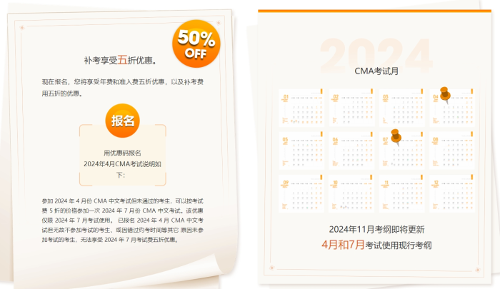 參加2024年4月份cma中文考試但未通過的考生,可以按考試費(fèi)5折的價(jià)格參加一次2024年7月份cma中文考試。該優(yōu)惠僅限2024年7月考試使用。