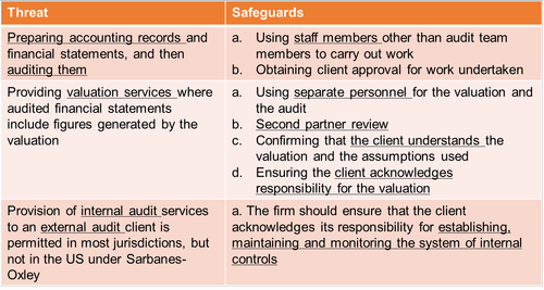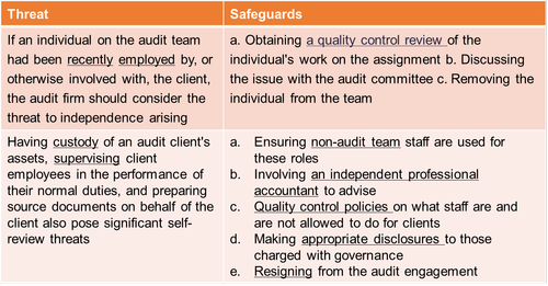 Safeguards would include disclosure of such threats to the audit committee for their consideration, review of work for any evidence of bias and even the possibility of removing affected individuals from the area under threat.