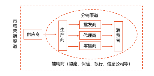 成員 | 參與某種商品供產(chǎn)銷過程的所有企業(yè)和個人,如供應商、生產(chǎn)者、各類中間商、輔助商以及最終消費者 中間商:批發(fā)商、零售商、代理商 輔助商:支持分銷活動的倉儲、運輸、金融、廣告代理機構等 | 商品從生產(chǎn)者向消費者轉(zhuǎn)移的過程中,取得這種商品的所有權或幫助所有權轉(zhuǎn)移的所有企業(yè)和個人,包括生產(chǎn)者、中間商和最終消費者 |