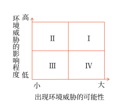 | Ⅰ(高威脅大概率):企業(yè)應(yīng)高度重視,必須嚴密監(jiān)視和預(yù)測環(huán)境的發(fā)展變化趨勢,積極采取相應(yīng)的對策 |