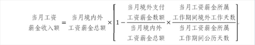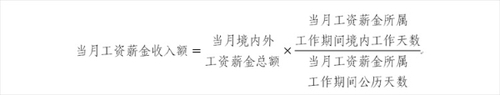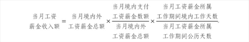 在一個(gè)納稅年度內(nèi),在境內(nèi)累計(jì)居住不超過90天的非居民個(gè)人,僅就歸屬于境內(nèi)工作期間并由境內(nèi)雇主支付或者負(fù)擔(dān)的工資薪金所得計(jì)算繳納個(gè)人所得稅。當(dāng)月工資薪金收入額的計(jì)算公式如下(公式一):