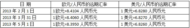 2013年2月1日,經(jīng)A公司董事會(huì)決定,簽訂了一項(xiàng)購買81.21萬歐元的遠(yuǎn)期合同。根據(jù)該合同,A公司將于2013年5月1日支付人民幣683萬元購入81.21萬歐元,匯率為1歐元=8.4104人民幣元。