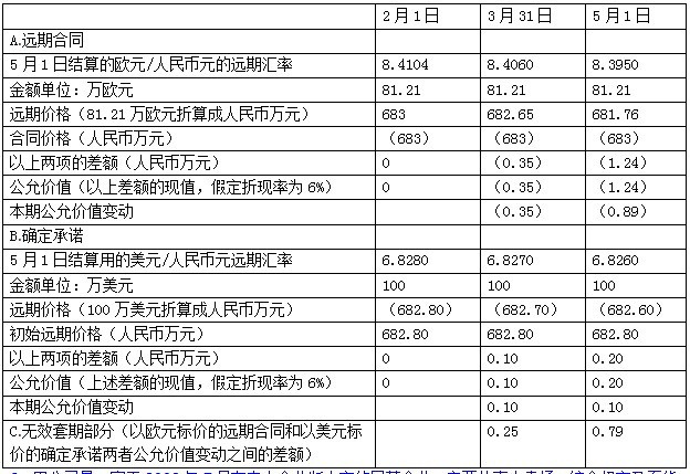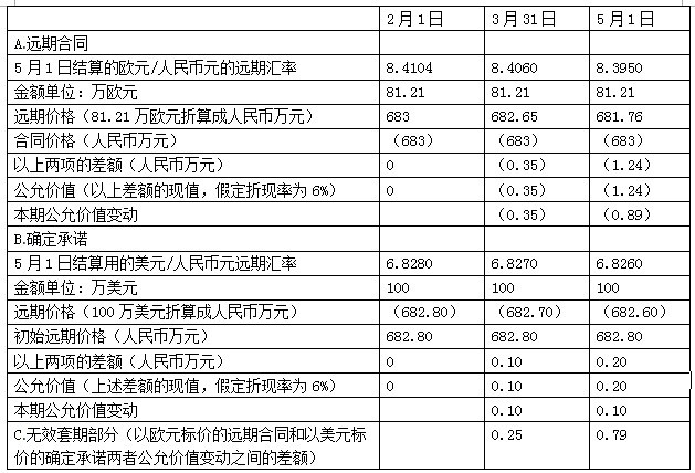 理由:(1)2013年2月1日,81.21萬歐元與100萬美元按2013年5月1日的遠(yuǎn)期匯率換算,僅相差0.2萬元(81.21×8.4104-100×6.8280=683-682.8=0.2);(2)遠(yuǎn)期合同和確定承諾將在同一日期結(jié)算;(3)最近三個(gè)月,人民幣元對(duì)歐元、人民幣元對(duì)美元的匯率變動(dòng)之間具有高度相關(guān)性。