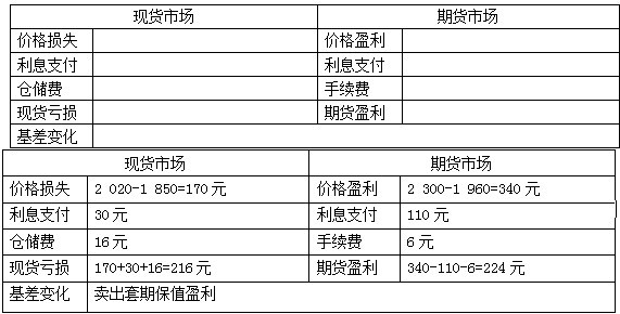 某大型糧油綜合企業(yè)集團(tuán)于2013年3至4月間在東北產(chǎn)區(qū)收購了5萬噸玉米。為規(guī)避玉米價(jià)格下跌風(fēng)險(xiǎn),避免現(xiàn)貨損失,該企業(yè)進(jìn)入期貨市場進(jìn)行庫存賣出套期保值操作。4月28日,企業(yè)以2 300元/噸價(jià)位賣出C905合約5 000手,手續(xù)費(fèi)6元/噸,利息110元/噸。當(dāng)時(shí)現(xiàn)貨價(jià)格為2 020元/噸,現(xiàn)貨尚未簽訂銷售合同。后來,受金融危機(jī)影響,期貨和現(xiàn)貨價(jià)格果然下跌,至8月17日,期貨價(jià)格下跌至1 960元/噸,而現(xiàn)貨價(jià)格下跌至1 850元/噸;此時(shí),該企業(yè)的現(xiàn)貨銷售完畢,同時(shí)在期貨市場平倉出場。倉儲(chǔ)費(fèi)16元/噸,利息30元/噸。期貨市場的盈利不但彌補(bǔ)現(xiàn)貨市場的損失,而且還有盈余。