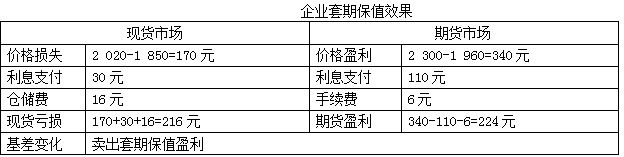 (2)通過對比分析可以看到,如果該企業(yè)不進(jìn)行套期保值,那么現(xiàn)貨購銷價(jià)格虧損為216元/噸,5萬噸總計(jì)虧損1080萬元;由于企業(yè)進(jìn)行了套期保值,最終反而實(shí)現(xiàn)盈利224-216=8元/噸,5萬噸總計(jì)盈利40萬元。