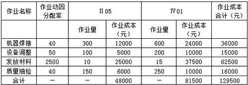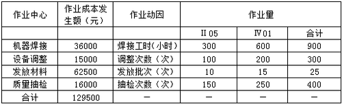 假設(shè)經(jīng)作業(yè)分析,該企業(yè)根據(jù)各項(xiàng)作業(yè)的成本動因性質(zhì)劃分了機(jī)器焊接、設(shè)備調(diào)整、發(fā)放材料和質(zhì)量抽檢四項(xiàng)作業(yè);各作業(yè)動因及作業(yè)成本發(fā)生額等有關(guān)資料如下表:
