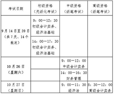初級(jí)資格無紙化考試于9月14-20日舉行;中級(jí)資格、高級(jí)資格考試于10月26-27日舉行。初級(jí)資格《初級(jí)會(huì)計(jì)實(shí)務(wù)》科目的考試時(shí)間調(diào)整為2小時(shí),《經(jīng)濟(jì)法基礎(chǔ)》科目的考試時(shí)間調(diào)整為1.5小時(shí),兩個(gè)科目考試時(shí)間共計(jì)3.5小時(shí);兩個(gè)科目連續(xù)考試,分別計(jì)算考試成績。