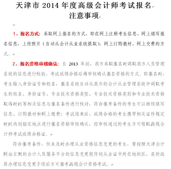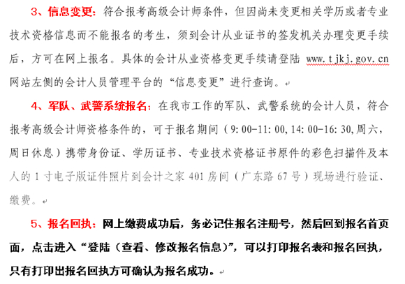 【東奧小編】天津2014年高級(jí)會(huì)計(jì)師考試報(bào)名時(shí)間為2014年4月15日至22日,采取網(wǎng)上報(bào)名的方式,報(bào)考人員登陸報(bào)名網(wǎng)址“https://www.tjkj.gov.cn”,在網(wǎng)上填寫報(bào)名信息,上傳照片和網(wǎng)上繳費(fèi)。報(bào)名期間應(yīng)注意的事項(xiàng)有: