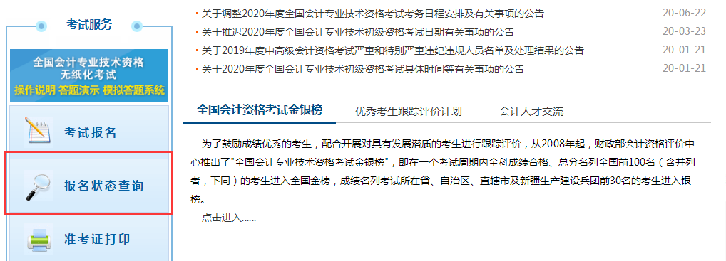 1.登陸全國會計資格評價網http://kzp.mof.gov.cn/,找到報名狀態(tài)查詢版塊