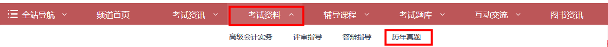 東奧會(huì)計(jì)在線官網(wǎng)的高級(jí)會(huì)計(jì)師頻道,整理了近三年高級(jí)會(huì)計(jì)師考試歷年真題??忌谶M(jìn)入高級(jí)會(huì)計(jì)師頻道后,可通過頁面上方的“考試資料”欄目,找到歷年真題,詳見下圖。