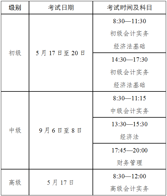 (三)考試時間及科目初級資格考試于2025年5月17日至20日舉行,考試科目包括《初級會計實務(wù)》、《經(jīng)濟法基礎(chǔ)》;中級資格考試于9月6日至8日舉行,考試科目包括《中級會計實務(wù)》、《經(jīng)濟法》、《財務(wù)管理》;高級資格考試于5月17日舉行,考試科目包括《高級會計實務(wù)》。具體安排如下: